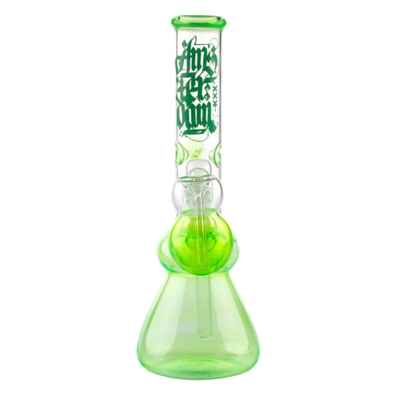 The Amsterdam Green Glass Water Pipe takes the simple beaker base scientific glass design to the next level. In term so functionality, upgrades include a dome percolator, a 3-prong ice pinch, and an included ash catcher/bowl combo. Other upgrades include the black accents on the base, mouthpiece, and ash catcher as well as the Amsterdam logo on the upper tube.